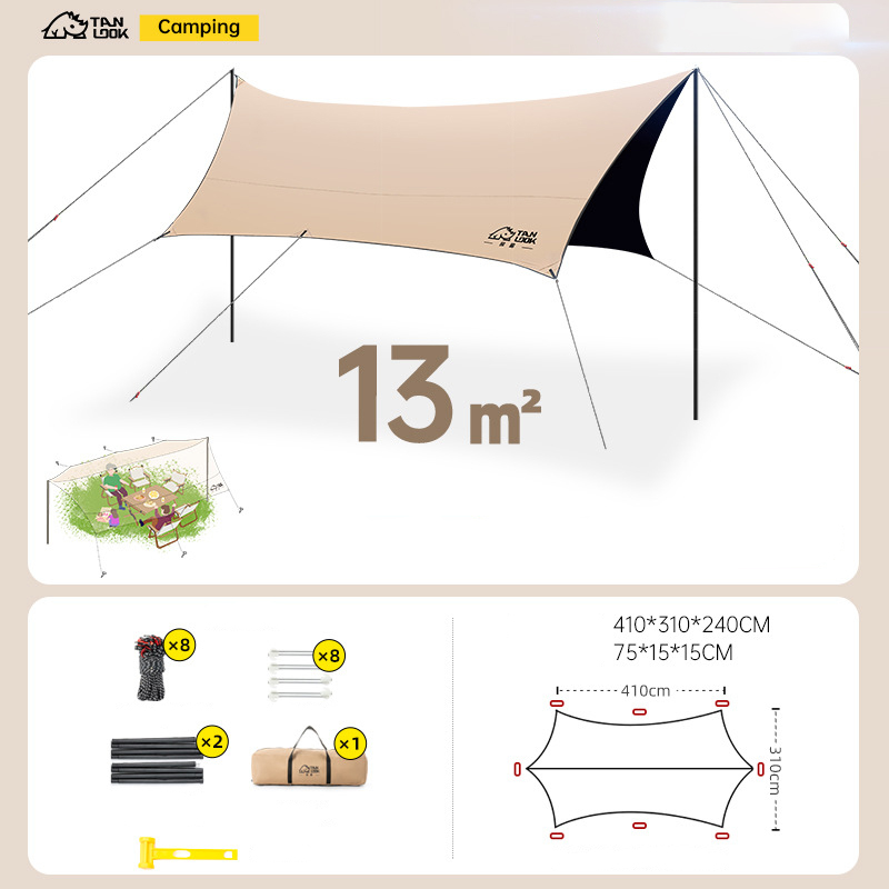سایه بان کمپینگ Tanlook مدل HW-13604 که مساحتی معادل 13 مترمربع را پوشش می دهد یکی از کاربردی ترین ابزار کمپینگ است. از آنجایی اغلب سفرهای کمپینگ در فصل های بهار و تابستان اتفاق می افتد، خرید یک سایبان کارآمد میتواند لذت این سفرها را بیشتر کند. در امان ماندن از تابش مستقیم خورشید می تواند به لذت بخش تر شدن سفر منتهی شود که می توان با خرید یک سایه بان کمپینگ ضدآفتاب به آن دست پیدا کرد. سایه بان کمپینگ tanlook با ابعاد باز شده حدود 410×310×240 سانتی متر برای 2 تا 3 نفر کافی است. سایه‌بان کمپینگ Tanlook مدل HW-13602